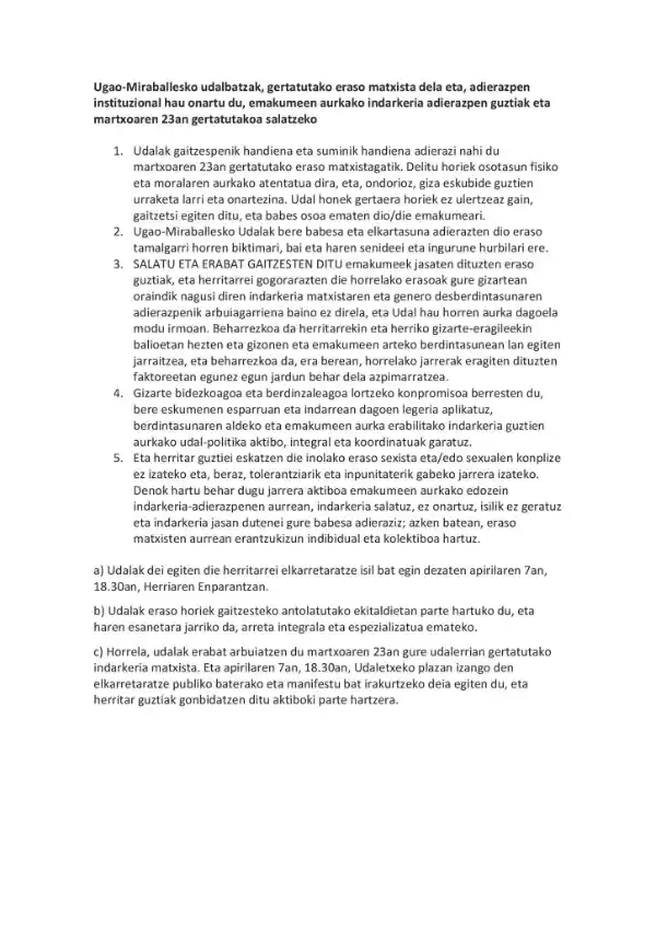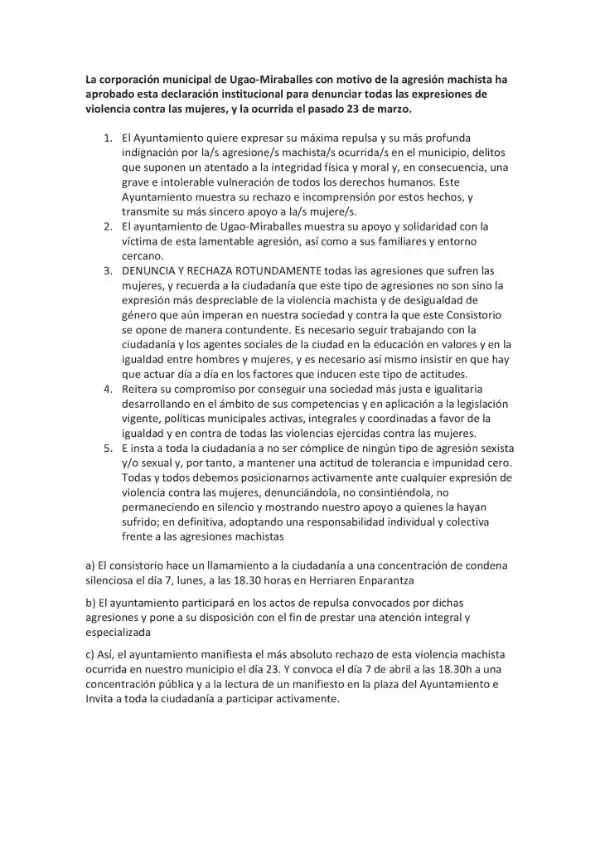 La Corporación Municipal de Ugao-Miraballes ha aprobado una declaración institucional para denunciar todas las manifestaciones de violencia contra las mujeres , en especial, la ocurrida en la localidad el 23 de marzo.