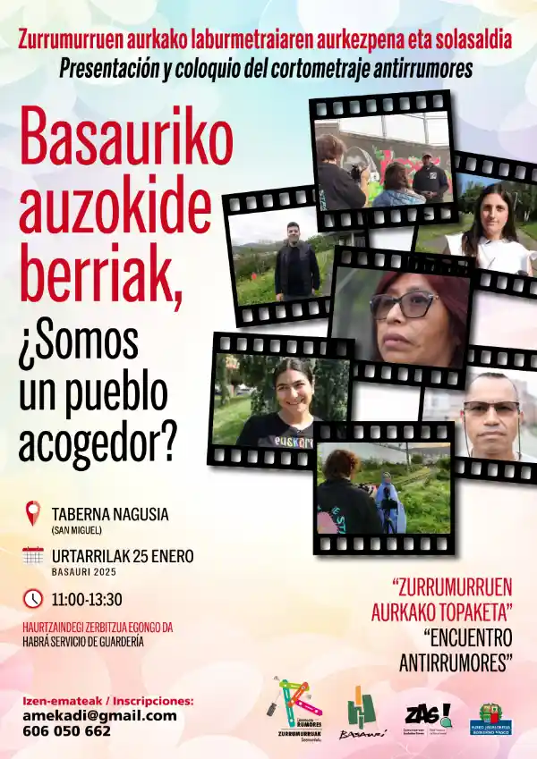 Este proyecto, nacido del encuentro anual antiRumores del enero pasado, tiene como objetivo visibilizar experiencias reales de personas migrantes que residen en Basauri que, con sus testimonios, reflejan sus sensaciones y propuestas en relación a la acogida recibida y a la construcción de una convivencia intercultural en el pueblo.