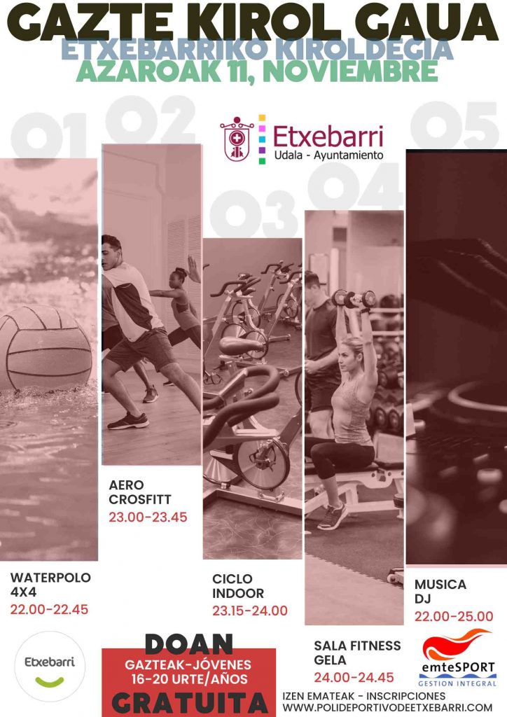 El Ayuntamiento de Etxebarri en colaboración con la empresa emteSPORT, que gestiona el polideportivo municpal, ofrecerán este viernes “Gazte Kirol Gaua”, una original iniciativa dirigida a los y las jóvenes etxebarritarras de entre 16 y 20 años para poder practicar varias disciplinas deportivas completamente gratis.