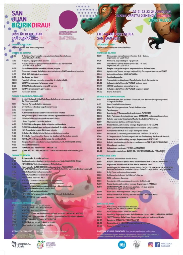 Urreta celebrará desde este viernes 20 de junio las fiestas de San Juan bajo el tradicional lema ‘San Juan Bizirik Dirau’. Aunque su amplio y variado programa de actividades, organizadas por Urretaldea Jai Batzorde Elkartea con el apoyo del Ayuntamiento de Galdakao, comienzan el viernes, mañana arrancan oficialmente con la apertura de las barracas, que cerrarán las fiestas el martes 24 (San Juan) con el día infantil.