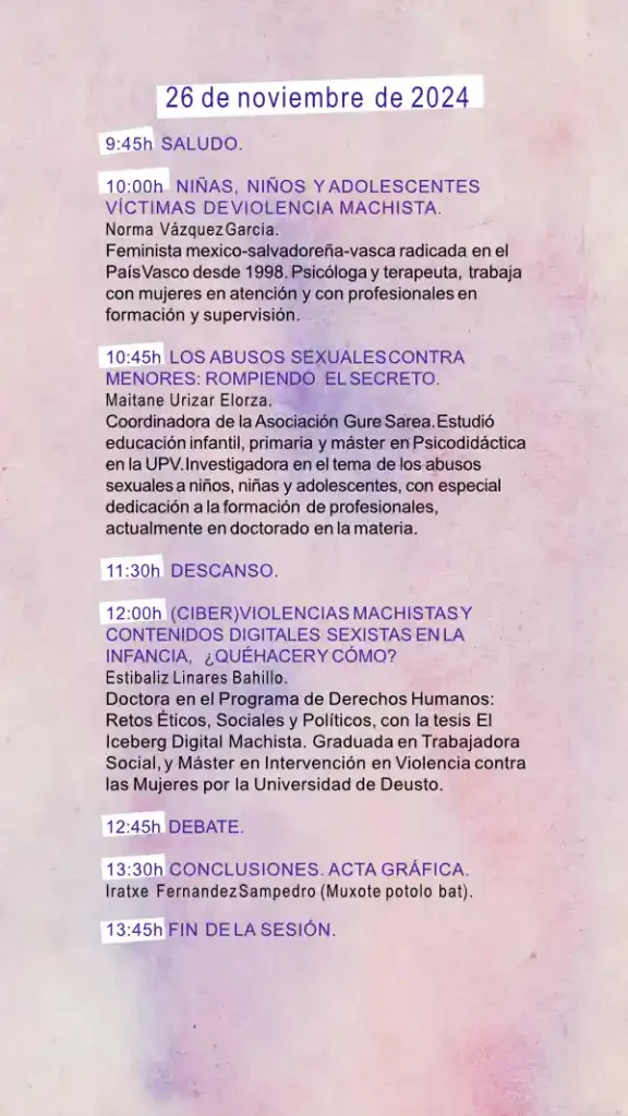 Ciberviolencia, los abusos sexuales, el impacto de la violencia de género en los hijos y las hijas, la violencia vicaria, la violencia institucional...Serán algunos de los temas que tratarán ponentes como, Norma Vázquez, Maitane Urizar, Estíbaliz Linares, Sheila Melcon, Beatriz Ilardia y Eva Haro