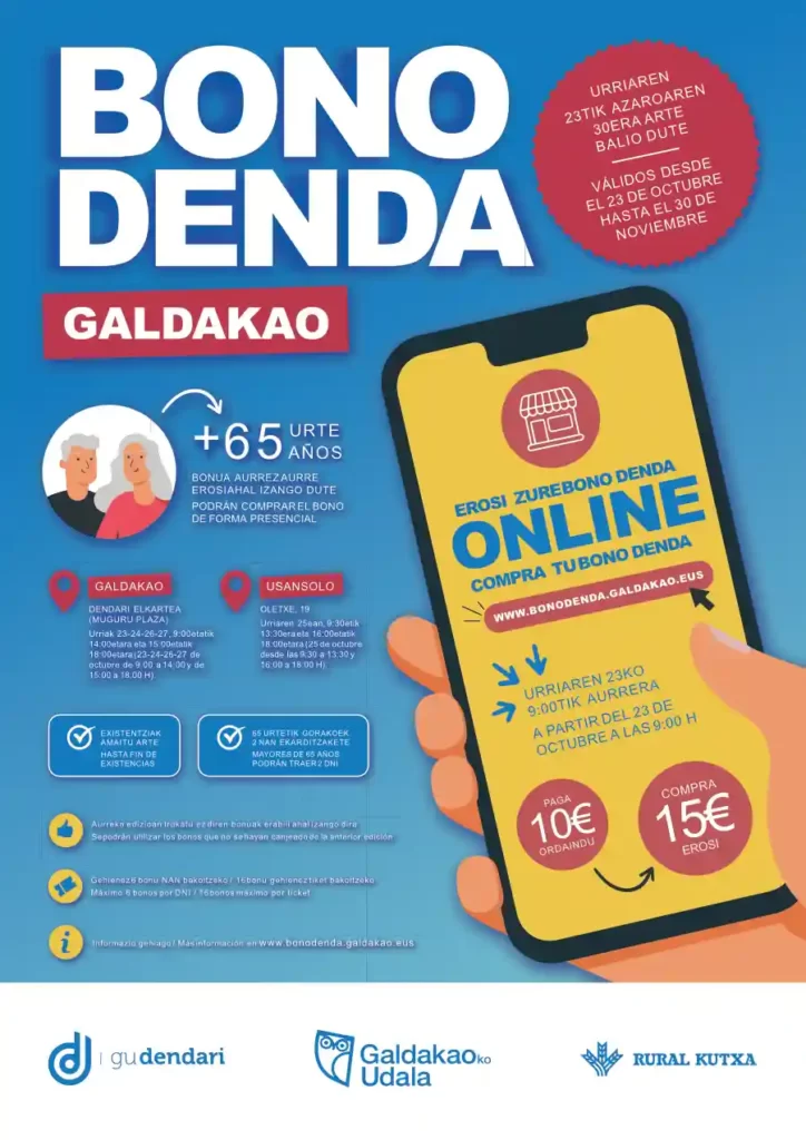podrán realizar la compra de forma presencial en la asociación de comerciantes Gu Dendari (Plaza Muguru) y en la oficina de la calle Oletxe 19 de Usansolo. Se podrá adquirir un máximo de 6 bonos por persona, pudiendo agruparse para la compra. La campaña finalizará el 30 de noviembre.