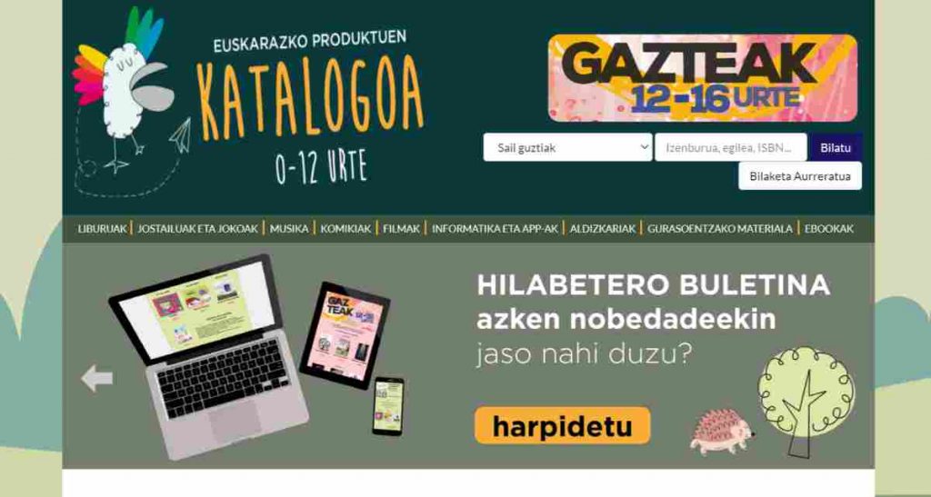 Además de mostrarlos en la web katalogoa-eus, también se repartirán los 70.000 ejemplares de la edición en papel en Álava, Bizkaia, Gipuzkoa y Navarra. Al igual que se ha venido haciendo en los últimos años, tanto la web como el catálogo editado en papel, se dividen en dos apartados: una portada da acceso a los productos que se ofrecen para jóvenes de 12 a 16 años y la otra portada a los productos para niños y niñas de 0 a 12 años. También existen materiales para padres y madres.