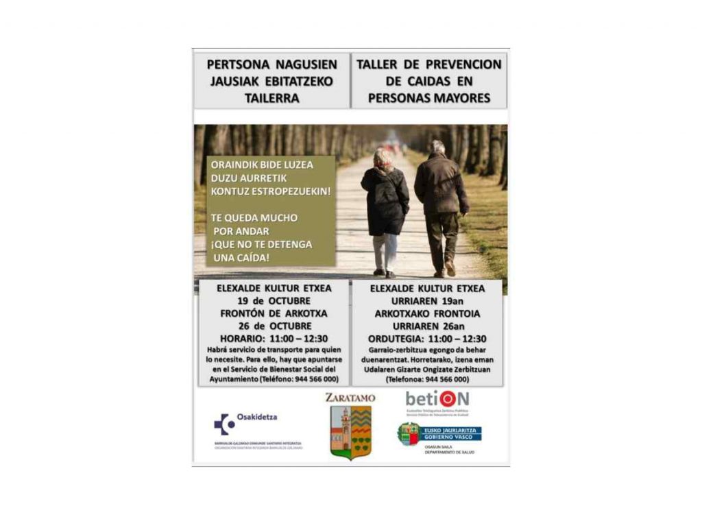 El Ayuntamiento de Zaratamo ha organizado un taller para la prevención de las caídas en las personas mayores este próximo 19 de Octubre en la Kultur Etxea de Elexalde y el 26, en el frontón de Arkotza, ambas de 11 a 12.30 H. Con el lema ,”Te queda mucho por andar. Que no te detenga una caída” estos talleres se han organizado en colaboración con Osakidetza y el servicio público de teleasistencia BetiOn.